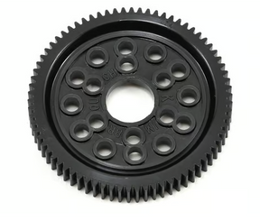 Kimbrough spur gears are full width, because a narrow or profiled plastic gear can deform under load, is weaker and less efficient. This can cause drag in the gear train and waste horsepower. The wider a gear is, the more load it can handle. The only time gear engineers narrow gears, is when there is a space limitation. Kimbrough Racing Products gears run quiet because they have the correct tooth shape and don't have to be narrowed. Choose from a variety of tooth count choices to allow you to fine tune the torque and top speed of your model.