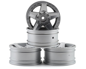 The MST 648 1.9" Crawler Wheel is a 5 spoke style wheel design, with modeled in 8 lug bolt details. These glue type wheels are pre-vented, measure 26mm wide and offer a +5mm offset. Package includes four wheels and a set of four serrated wheel nuts