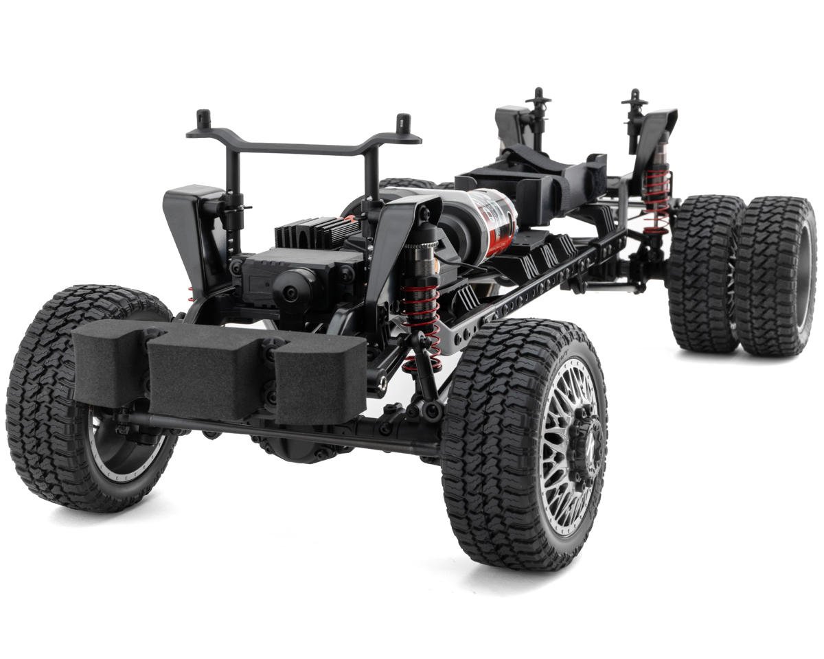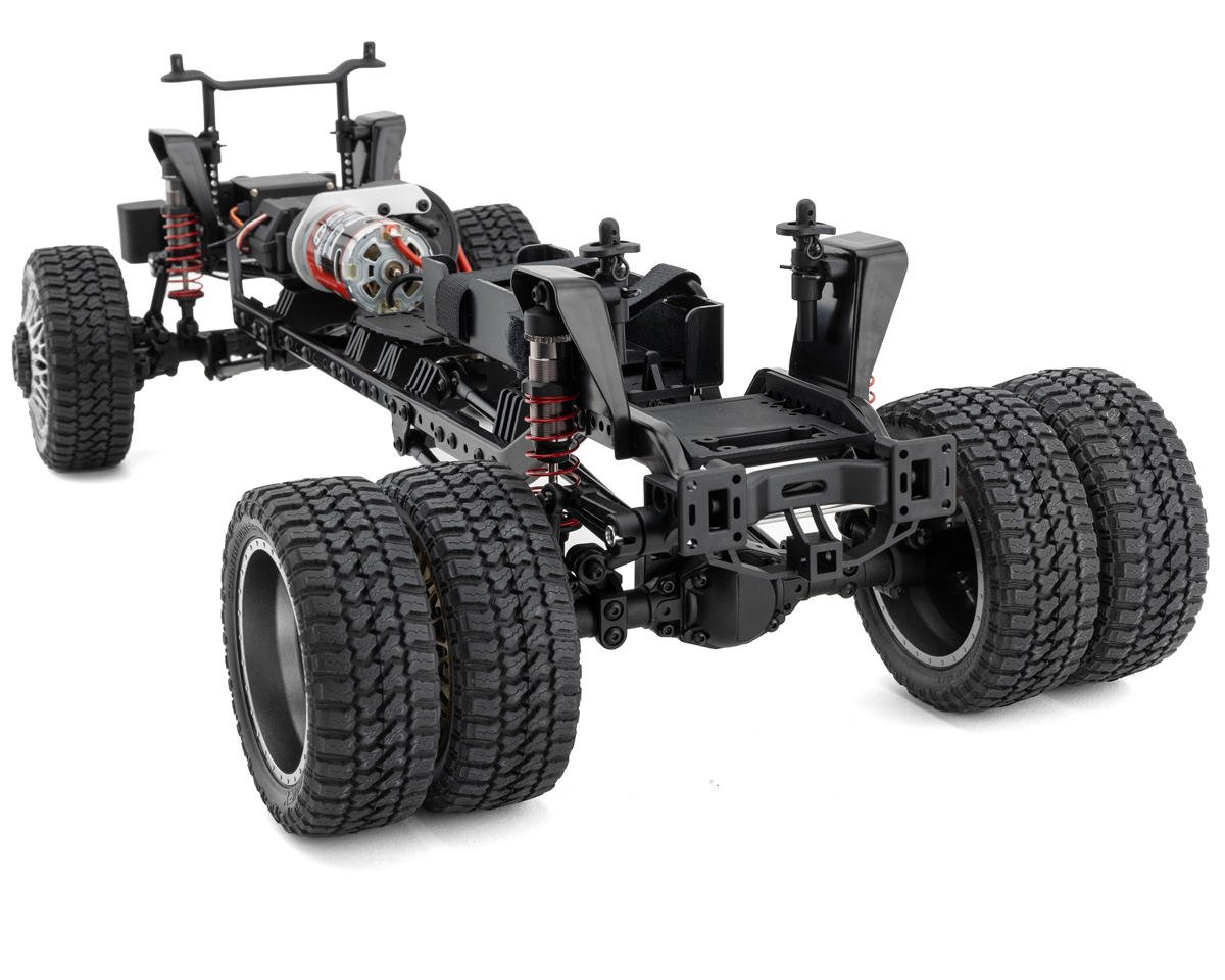 The steel-frame rails and chassis-mounted servo (CMS) chassis design provide a sturdy backbone for the truck, ensuring durability during rugged use. Stamped steel shock hoops and a steel skid plate enhance the structural integrity, while adjustable turnbuckles and a high-torque servo horn ensure fine-tuned performance. This chassis is complimented by the KG1 Forged Trident-D wheels, designed to combine striking aesthetics with functional durability. These precision-engineered wheels feature a realistic design, with a thirty-five-millimeter width at the front and a thirty-one-millimeter width at the rear, enhancing the truck's authentic scale appearance.