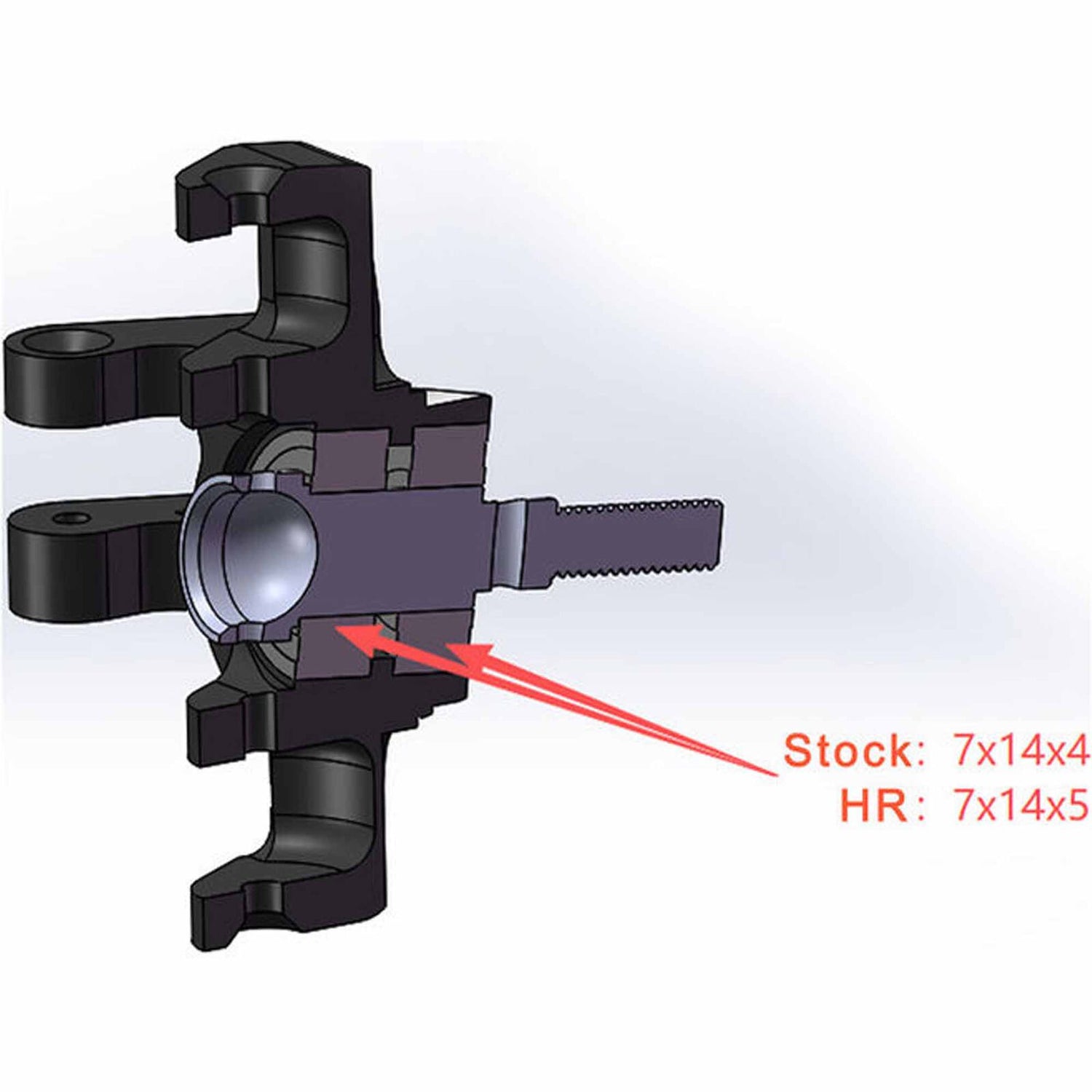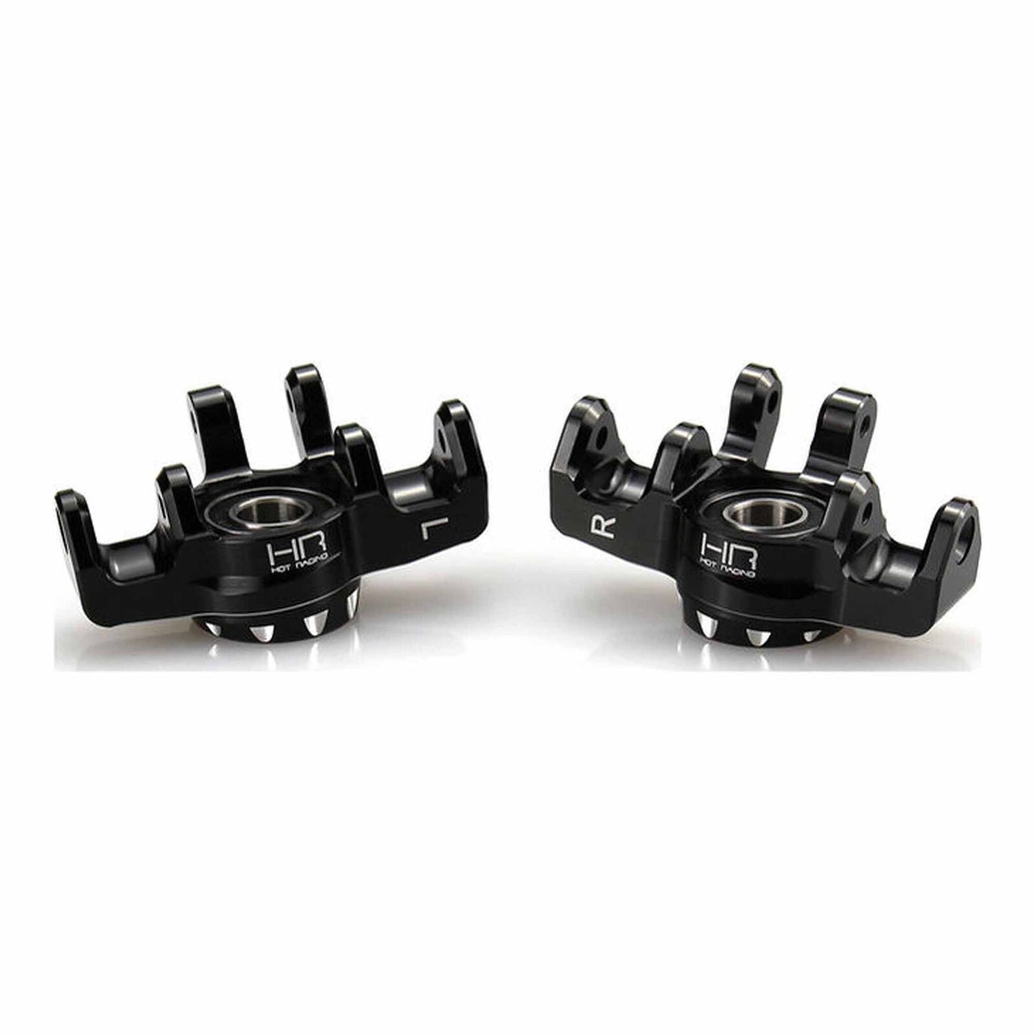 Upgrade the front steering assembly of your 1/16 ARRMA Mini Kraton with the Hot Racing's Aluminum Front Knuckle/Spindle Set. Precision CNC-machined and anodized in black, this heavy-duty replacement enhances durability, steering precision, and bearing support compared to the stock nylon components. Installation required. Removable thread lock is recommended for screws threading into the steering block.