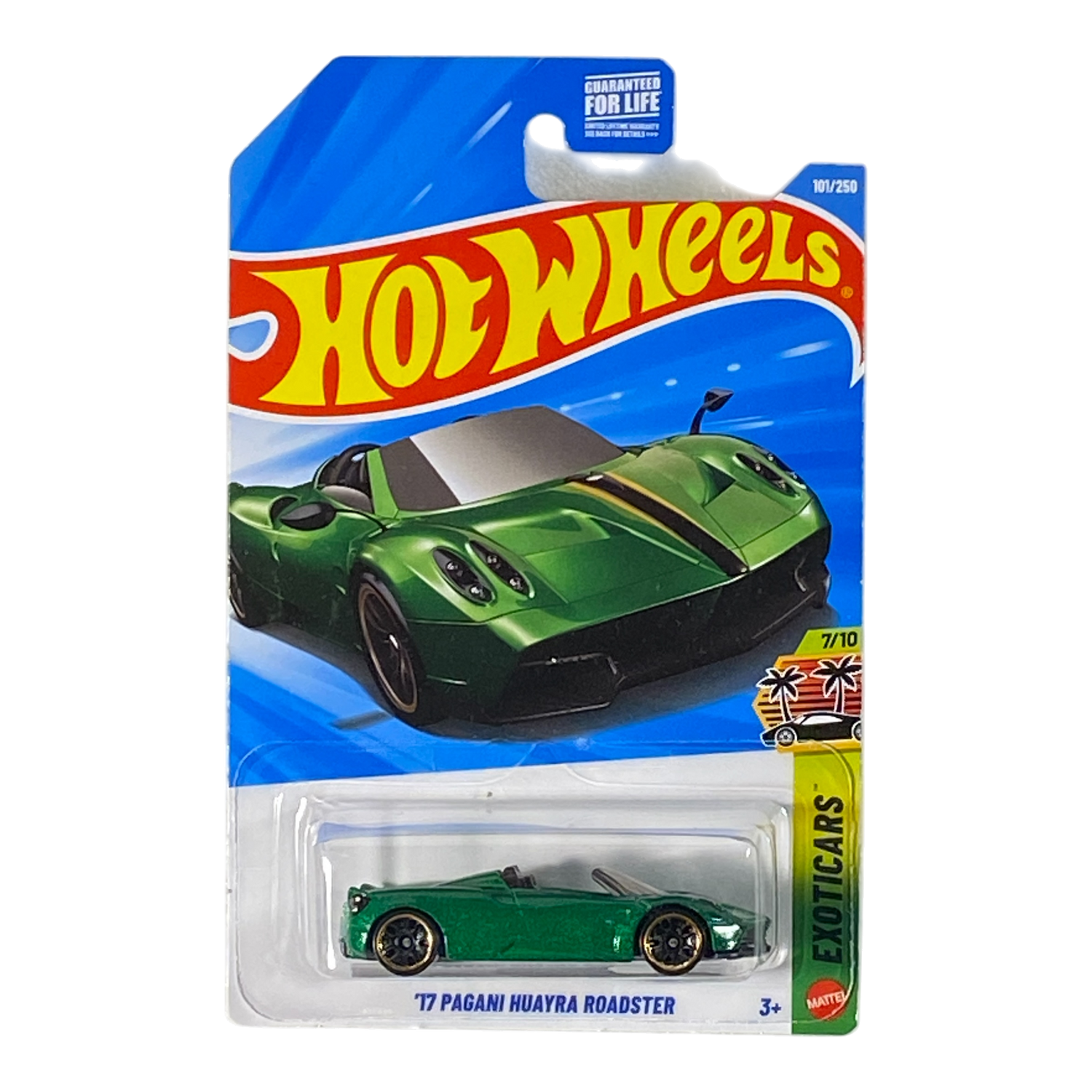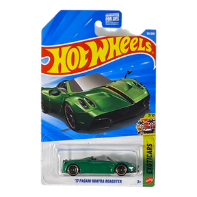 The green Hot Wheels '17 Pagani Huayra Roadster Exoticars Series 7/10 is a vibrant 2026 1:64 scale hypercar model that brings the exotic Italian styling of the Pagani Huayra Roadster to life in a bold metallic green – a standout addition for supercar collectors and Exoticars series enthusiasts.