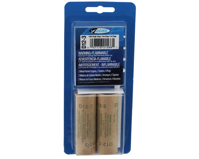 The Estes D12-3 Standard Single Stage Engines are powerful and reliable rocket engines designed to propel your model rockets to impressive heights. With a twenty-four-millimeter diameter, these engines are perfect for rockets weighing up to fourteen ounces, making them ideal for mid-sized and heavier models. Each package includes two engines, two starters, and four starter plugs, ensuring you have everything you need for a successful launch. Whether you're a hobbyist or an experienced rocketeer, the D12-3 engines deliver consistent performance and excitement.
