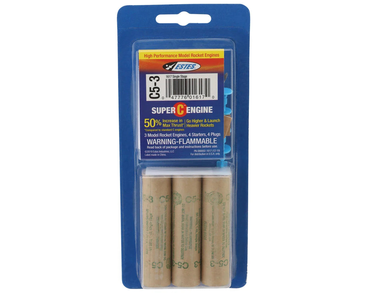Estes C5-3 Single Stage Engines. Designed for larger birds and payload rockets with a total of 50% increase in maximum thrust over a standard C engine to provide the punch needed to propel heavier rockets!