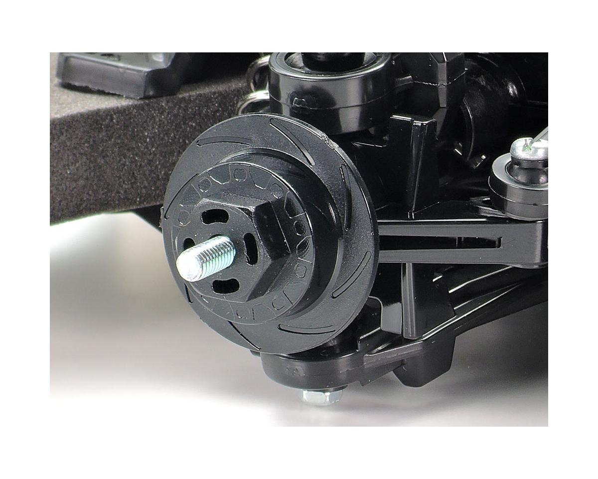 The TT-02 chassis, with its adaptable and balanced shaft-driven 4WD system, ensures excellent stability through a longitudinal layout featuring the battery on the left and the motor on the right. Its design incorporates identical left and right suspension arms and uprights for straightforward assembly, along with easily maintainable gearboxes. The chassis offers versatility with two wheelbases, two ground clearance settings, two tread setups, and a selection of ten gear ratios. Not only functional, it boasts aesthetic appeal with brake disc-shaped wheel hubs, stylish front bumper supports, gun metal color 10-spoke wheels, and sleek slick tires, delivering a sporty appearance.