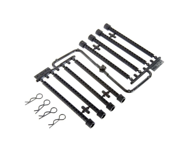 Tamiya Body Mount Extension Set. These body mounts fit TT-01, TT-02, TA-05, TA-08, TB-03, TB-04, XV-01, FF-03, M-05, and M-06 chassis cars. Package includes eight body mounts and four body clips.
