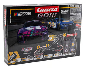 Experience the thrill of NASCAR racing at home with the Carrera GO!!! NASCAR Talladega Competition slot car racing set. Featuring officially licensed NASCAR Camaro NextGen ZL1 cars from Hendrick Motorsports, this 1:43 scale set offers high-speed excitement on a 16.08-ft. track. The set includes a lap counter, flyover, junction track, and two iconic cars driven by Chase Elliott and Alex Bowman. Perfect for NASCAR fans aged six and up, this set provides endless racing fun.