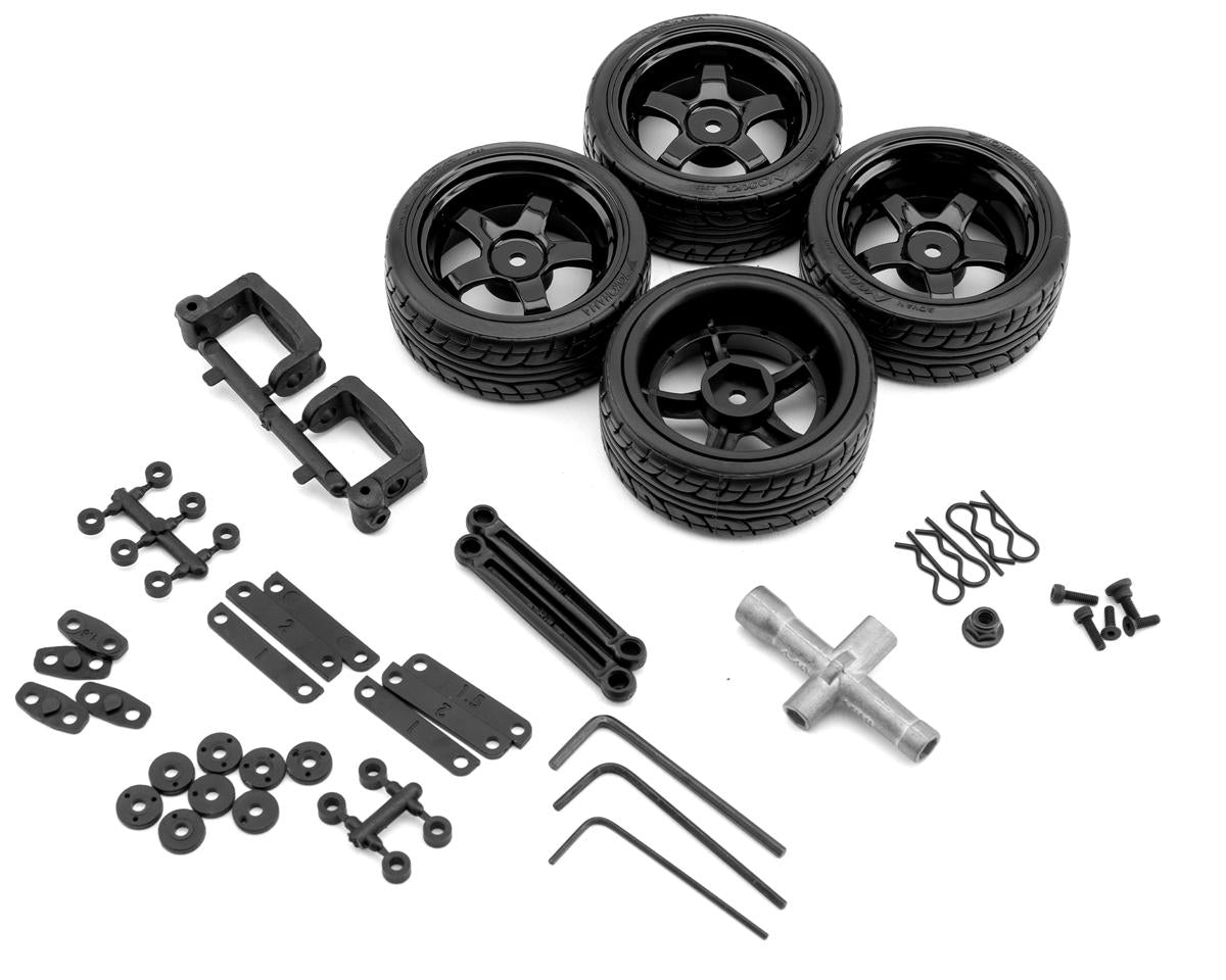 This truck includes two sets of tires and wheels, allowing users to switch between drift and grip setups with ease. The Advan Neova AD07 T-Drift Tires provide a stiff and hard plastic surface ideal for drifting, while the Spec-Grip Tires offer excellent traction for street racing. The full-time four-wheel-drive system, combined with a double wishbone suspension and oil-filled shocks, ensures optimal handling and performance on various surfaces. The fully adjustable suspension and shock positions further enhance the driving experience, allowing for fine-tuning based on road conditions.