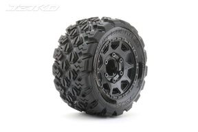 Neumáticos Jetko 2802CBMSGNB3 1/10 MT 2.8 King Cobra montados sobre llantas con garras negras