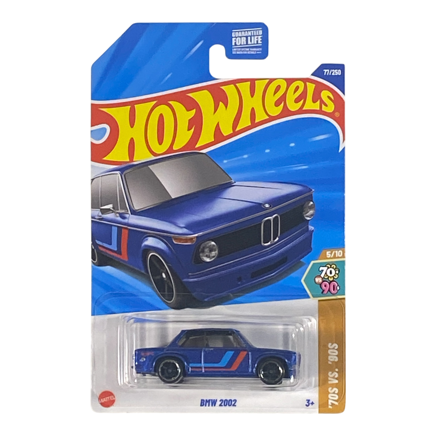 The 2025 Hot Wheels BMW 2002 #5/10 '70s vs. '90s is a metallic blue 1:64 scale diecast classic sedan replica celebrating '70s BMW heritage, a must-have new casting for Euro car and Hot Wheels collectors.