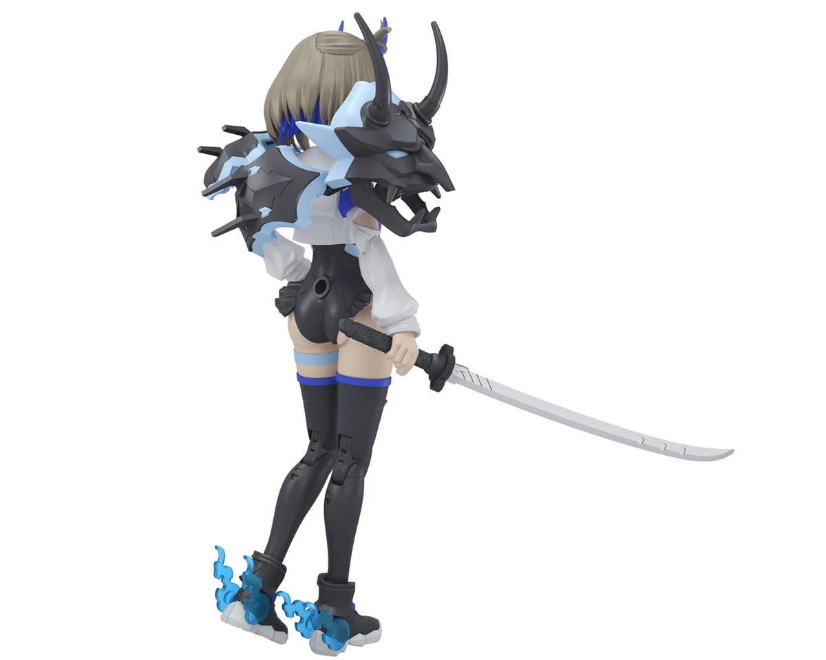 The Bandai 30MS SIS-N00 Sourei is another immaculate addition to the 30 Minute Sisters model kit series. Sourei brings a unique look to the collection with her expressive design, which includes three types of tampo-printed face plates: shy, normal, and screaming, allowing for a range of emotional displays. The model features a two-layered hairstyle with interchangeable bang parts for added customization. Her design is further accentuated by her distinctive armor set, including a demon mask on her shoulder with an articulated jaw. Sourei is equipped for action with a blade that features varying textures and a flame effect made of translucent material, which can be attached to either the blade or her shoes for a striking visual effect.