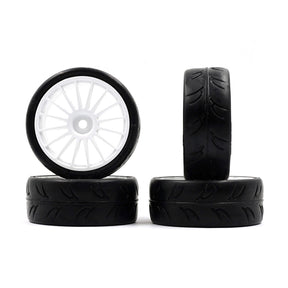 Treaded wheelset perfect for using in your GT or FWD touring car! Comes with a plastic wheel container great for organising your wheelsets on your pit table.