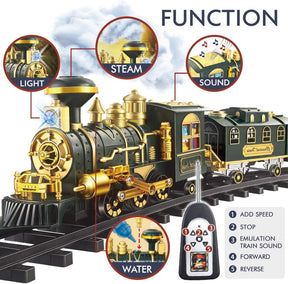 - šćNew Classic Train Track Setć: Our upgraded train set is made of eco-friendly material and larger the others in the market. This product also comes with the remote control which the buttons allow train to go forward, reverse, stop, add speed, sound on/off.