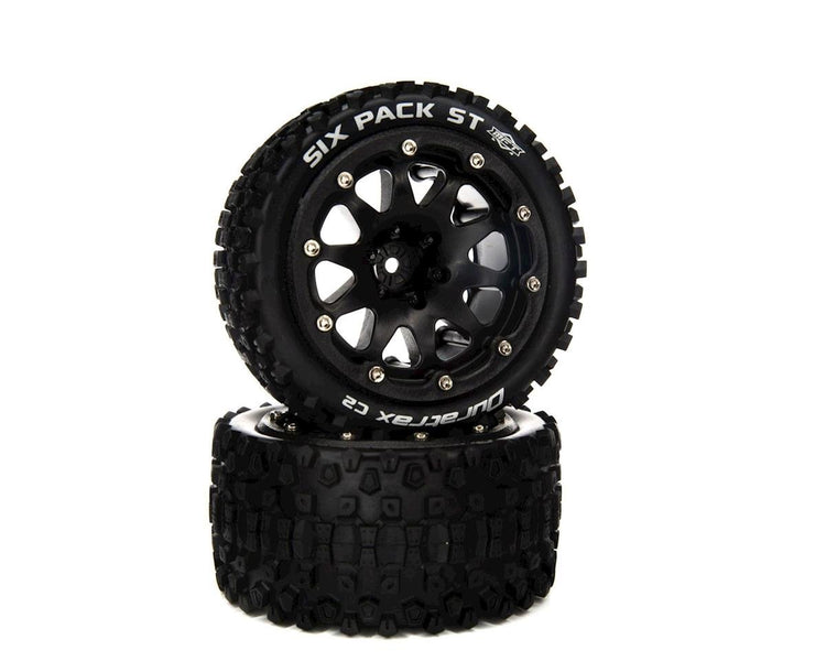 Factory-mounted, these Duratrax® SIX PACK™ ST front/rear tires for the 1/10 scale ARRMA® GRANITE™ 4X4 BLX Monster Truck feature a tread pattern that's perfect for running on a wide range of surfaces — including asphalt, grass, and loose or hard-packed soil — and in wet or dry conditions. Molded from a durable black composite plastic, the 14mm hex wheels measure 2.8 inches (56.3mm) wide and 4.8 inches (122.1mm) in diameter. The belted tires include one-piece foam inserts and white sidewall markings, and are made from high-traction C2 soft compound. Sold in pairs.