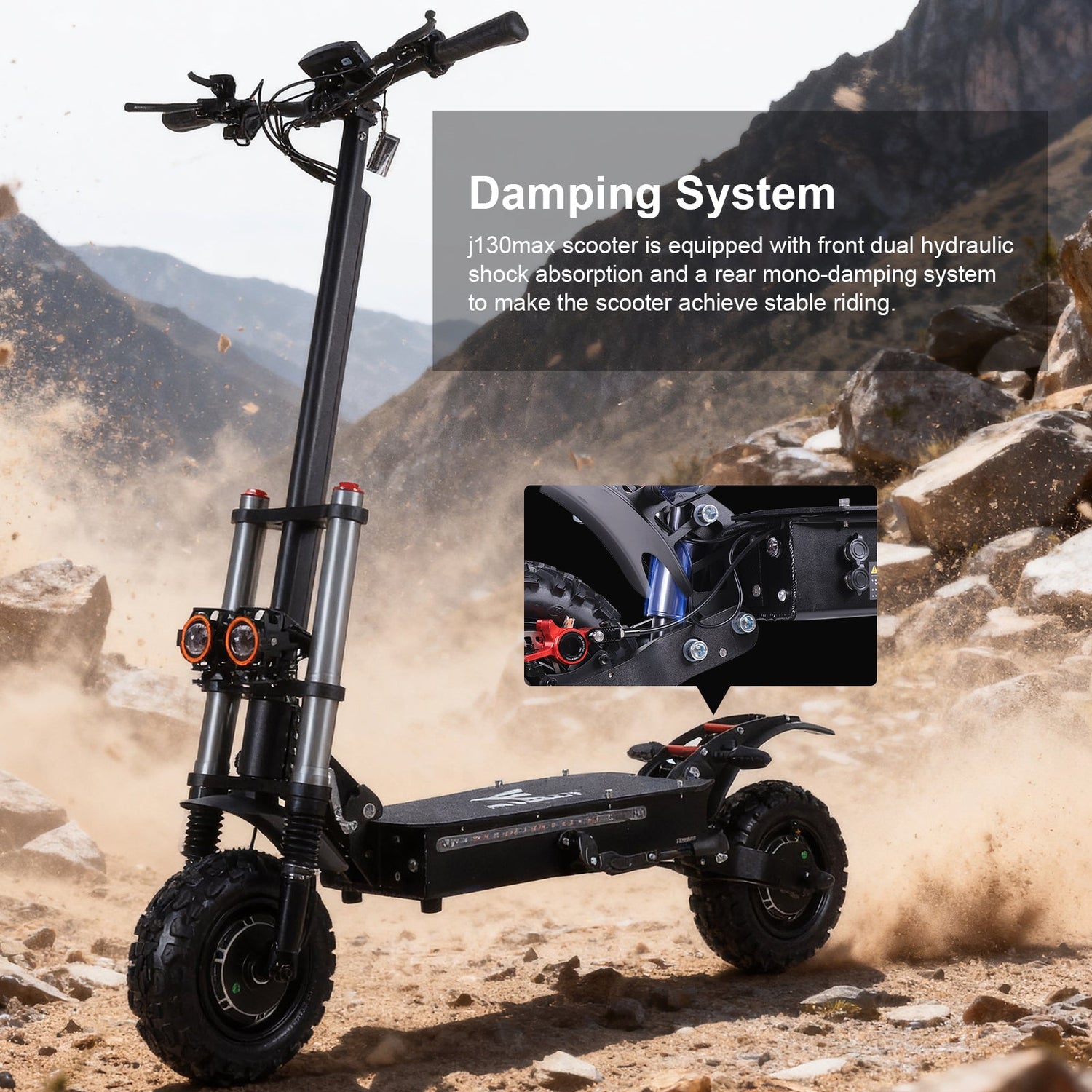 High-Performance Electric Scooter - Powered by dual 3000W motors (6000W total), FREEBOY J30 MAX reaches up to 50-55 mph with a 90-100 km range. Conquer 40° slopes with 11" off-road tires and ride comfortably with dual hydraulic shocks. Safety features include dual oil brakes, LED lights, turn signals, and IPX5 waterproofing. Foldable and durable (max load 200 kg), ideal for city and off-road use. 12-month support included.