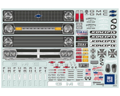 The years 1967-1972 showed a lot of looks through Chevrolet and GMC variants. With small changes to grille, headlights, and trim packages throughout the years, JConcepts has added a bonus to the included decal sheet. Four different grille options are included on the sheet giving the user the option of their favorite package from yesteryear. Hard panned single headlight and double light bezel setups are included which contain bar and tube grille combinations. In addition, a plethora of badges are offered on the sheet featuring Cheyenne, Custom, C/10, C/20, and CST/10 combinations.