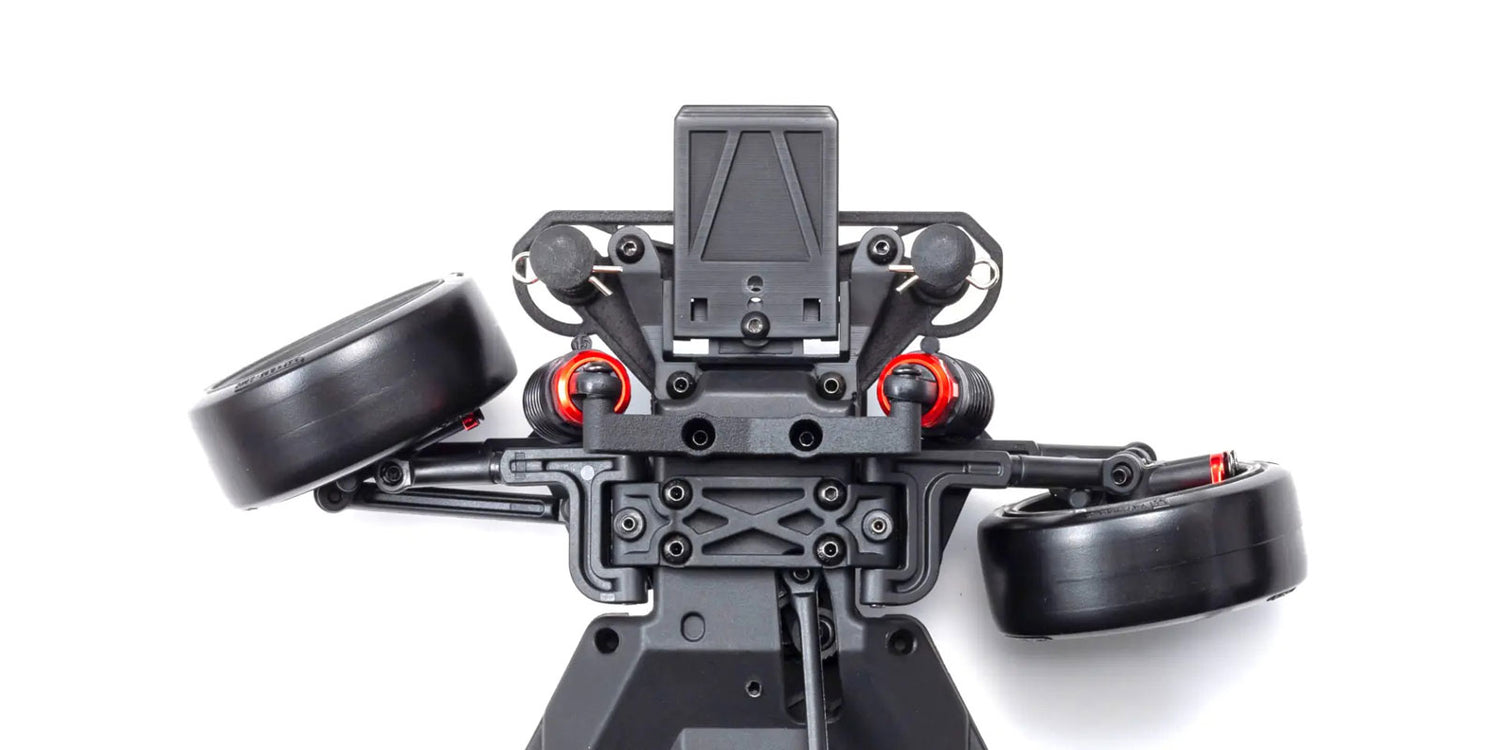 The FAZER series Readyset is primed for action straight out of the box, simply load a charged battery on the car and insert batteries into the transmitter. Now the long-awaited RWD drift-spec FAZER D2 model has arrived! Rear two-wheel drive (RWD) is the standard configuration for current 1/10 scale drifting R/C cars and slides over the road surface under heavy counter-steer, just like a true drifting machine. With its drift-spec RWD chassis, the FAZER D2 features different weight distribution and suspension design to the standard FAZER as well as a receiver with built-in gyro unit that automatically controls counter-steer for optimal body slide. The gyro controls both steering and throttle, allowing newcomers to drifting to drift drive like a pro. The chassis also incorporates other modern R/C drift car components such as long-span suspension arms and a high-mounted motor for easy handling and setup. Even though this FAZER is packaged as a Readyset, you can still change and upgrade parts for custom tuning and setting of the D2 like a pure R/C car. To complete the full drift machine experience, this model includes Kyosho's ultra-scale body and a variable wheelbase that allows a variety of body styles to be mounted. Traditionally, 1/10 scale drift cars have been the domain of experienced drivers but the complete FAZER D2 Readyset package brings the thrill of drifting machines within easy reach.